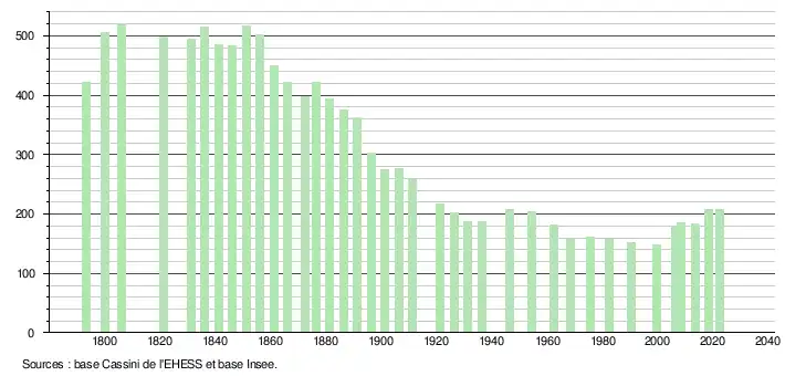 L'évolution du nombre d'habitants est connue à travers les recensements de la population effectués dans la commune depuis 1793. Pour les communes de moins de 10 000 habitants, une enquête de recensement portant sur toute la population est réalisée tous les cinq ans, les populations de référence des années intermédiaires étant quant à elles estimées par interpolation ou extrapolation[20]. Pour la commune, le premier recensement exhaustif entrant dans le cadre du nouveau dispositif a été réalisé en 2008[21].