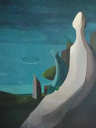 Les rares "personnages" restent toujours à l'état de silhouettes d'un monde figé ; les "objets" et vues rêvées y restent d'ailleurs toujours dominants.