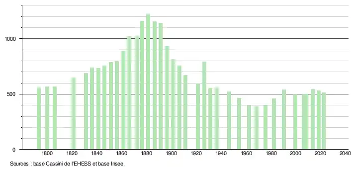 L'évolution du nombre d'habitants est connue à travers les recensements de la population effectués dans la commune depuis 1793. Pour les communes de moins de 10 000 habitants, une enquête de recensement portant sur toute la population est réalisée tous les cinq ans, les populations de référence des années intermédiaires étant quant à elles estimées par interpolation ou extrapolation[18]. Pour la commune, le premier recensement exhaustif entrant dans le cadre du nouveau dispositif a été réalisé en 2008[19].