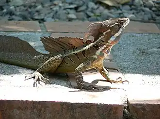 Mais l'iguane vert peut également se défendre activement. Face à une menace, il gonfle son cou, hérisse sa crête dorsale, souffle et agite son fanon, pour impressionner son adversaire. Il peut ensuite passer à l'attaque, en se jetant sur son adversaire pour le mordre, en faisant claquer sa longue queue comme un fouet[7].
