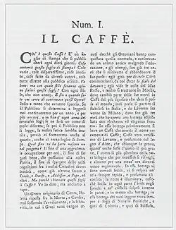 Il Caffè a été publié pour la première fois en juin 1764. Les fondateurs étaient les frères Alessandro et Pietro Verri. Ils ont également dirigé le magazine qui s'inspire des publications anglaises The Spectator et The Tatler. Il couvrait des articles concernant l'économie, l'agronomie, l'histoire naturelle et la médecine. Le contributeur le plus connu du Caffè était le philosophe et économiste Cesare Beccaria. Elle fut fermée en mai 1766 en raison des disputes entre Verri et Beccaria.