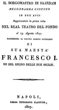 Il borgomastro di Saardam est un dramma giocoso en deux actes de Gaetano Donizetti. La première eut lieu au Teatro Nuovo ou au Teatro del Fondo, à Naples, le . La distribution comprenait la prima donna Caroline Unger, pour laquelle Donizetti avait composé le rôle de la protagoniste. Le livret de Domenico Gilardoni repose sur la comédie Le Bourgmestre de Saardam ou les Deux Pierre (1818) de Mélesville, de Jean-Toussaint Merle et d'Eugène Cantiran de Boirie. L'opéra connut un grand succès à Naples, mais fut un échec à Milan l'année suivante[4]. Albert Lortzing s'inspira de la mëme histoire pour composer son opéra Zar und Zimmermann en 1837.
