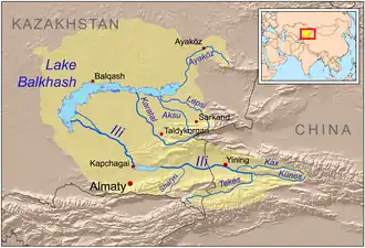 Long de 1 439 km, il prend sa source dans les Tian Shan (Monts célestes) dans la province du Xinjiang, en Chine, et se jette dans le lac Balkhach, au Kazakhstan.