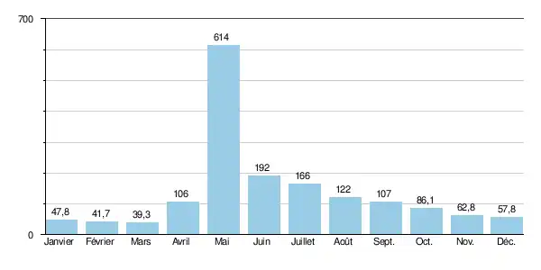 En ne considérant que la période estivale, la seule vraiment importante car libre de glaces (de mai à septembre inclus), le débit mensuel minimal observé a été de 48,5 m3/s en , ce qui restait appréciable comparé à la moyenne des mois d'été.