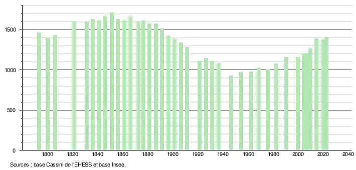 L'évolution du nombre d'habitants est connue à travers les recensements de la population effectués dans la commune depuis 1793. Pour les communes de moins de 10 000 habitants, une enquête de recensement portant sur toute la population est réalisée tous les cinq ans, les populations de référence des années intermédiaires étant quant à elles estimées par interpolation ou extrapolation[27]. Pour la commune, le premier recensement exhaustif entrant dans le cadre du nouveau dispositif a été réalisé en 2004[28].