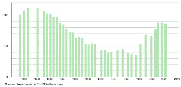 L'évolution du nombre d'habitants est connue à travers les recensements de la population effectués dans la commune depuis 1793. Pour les communes de moins de 10 000 habitants, une enquête de recensement portant sur toute la population est réalisée tous les cinq ans, les populations de référence des années intermédiaires étant quant à elles estimées par interpolation ou extrapolation[21]. Pour la commune, le premier recensement exhaustif entrant dans le cadre du nouveau dispositif a été réalisé en 2005[22].