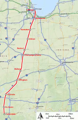 L'Illini et le Saluki utilise uniquement les voies du Canadien National qui a succédé à l'Illinois Central Railroad. La longueur du trajet est d'environ 500 km[13].