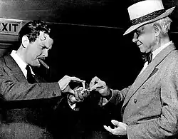 Orson Welles en train de faire un tour de cartes à Carl Sandburg (août 1942).