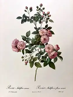 Pierre-Joseph Redouté (1759-1840), surnommé « le Raphaël des fleurs », fut peintre de Marie-Antoinette, travailla au Museum, partit à Kew, revint dessiner pour l'Académie des Sciences, fut le peintre de Joséphine de Beauharnais, puis donna des cours de dessin au Muséum. On lui doit un très grand nombre d’œuvres de première qualité. On peut signaler un catalogue de fleurs, Description des plantes nouvelles et peu connues, cultivées dans le jardin de J. M. Cels. Avec figures montrant des plantes exotiques cultivées par l’horticulteur Cels. L’auteur est le botaniste Etienne Pierre Ventenat. L’une des élèves de P-J Redouté fut (en) Henriette Vincent. Dans l'avant-propos de Les Roses, Redouté parcourt rapidement l'histoire de l'illustration botanique depuis l'Antiquité[24]. Il se concentre ensuite sur l'histoire de la représentation des roses[25].