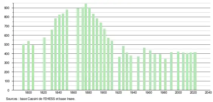 L'évolution du nombre d'habitants est connue à travers les recensements de la population effectués dans la commune depuis 1793. Pour les communes de moins de 10 000 habitants, une enquête de recensement portant sur toute la population est réalisée tous les cinq ans, les populations de référence des années intermédiaires étant quant à elles estimées par interpolation ou extrapolation[20]. Pour la commune, le premier recensement exhaustif entrant dans le cadre du nouveau dispositif a été réalisé en 2006[21].