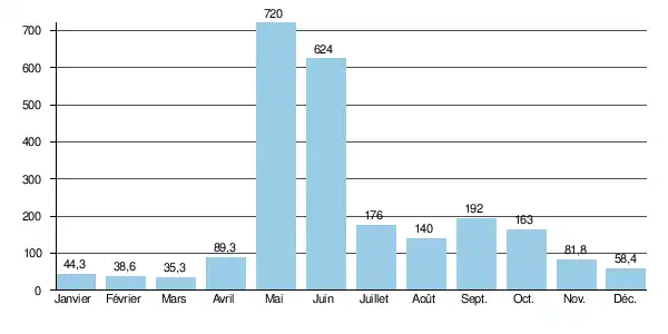 Le débit moyen mensuel observé en mars (minimum d'étiage) est de 35,3 m3/s, soit plus ou moins 5 % du débit moyen du mois de mai (720 m3/s), ce qui témoigne de l'amplitude importante des variations saisonnières. Sur la durée d'observation de 28 ans, le débit mensuel minimal a été de 28,0 m3/s en , tandis que le débit mensuel maximal s'élevait à 1 180 m3/s en .