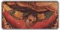 • Un ange (chérubin) ayant deux ailes avec plumes, aux bras tendus, porte la robe sur ses pieds nus qui ne sont pas colorés[N 1]. L'ange n'est visible que jusqu'à la ceinture, et ses pieds semblent se perdre dans la nuée qui nimbe toute l'image.