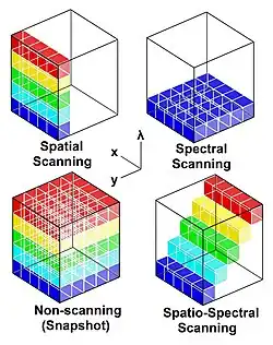 Plusieurs techniques peuvent être utilisées pour l'acquisition d'une image hyperspectrale dans le domaine optique (lumière visible, infrarouge). L'instrument dispose d'une optique qui fournit une image à l'entrée d'un spectrographe. Ce dernier utilise un élément dispersif ou à transformation de Fourier.