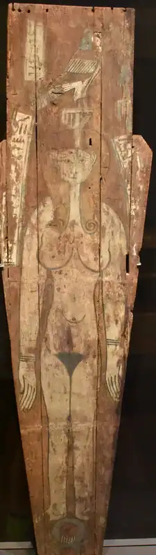 Sur un fragment de cercueil correspondant à l'intérieur de la base du sarcophage de la momie, on peut voir une représentation de la déesse Imentèt, en allusion claire à la nécropole et au lieu où les défunts avaient leur demeure dans l'éternité.