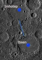 Lors des trois survols de Mariner 10 de 1974 à 1975 les images récoltées sont utilisées pour reconnaître les chaînes de cratères qui n'étaient pas associées à des éjections de cratères secondaires provenant de structures d'impact observées. Une telle chaîne de cratères est identifiée près des cratères Imhotep et Ibsen[12].