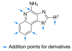 Une imidazoquinoléine est un composé hétérocyclique tricyclique constitué d'un cycle de pyridine fusionné d'une part avec un cycle benzénique (quinoléine) et d'autre part avec un cycle d'imidazole. Ces dérivés sont souvent utilisés comme crèmes antivirales[1] et antiallergiques[2].