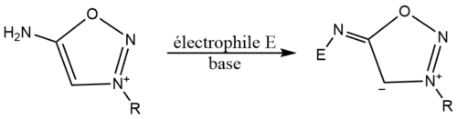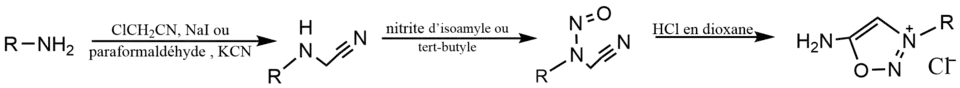 Cette voie de synthèse a été la seule décrite jusqu’à présent pour former des sels iminosydnones. Ces derniers sont ensuite capables de réagir avec de puissants électrophiles[7] pour produire des iminosydnones possédant l’amine exocyclique substituée et ainsi décliner cette famille chimique. En condition basique, l’iminosydnone non substitué sur son azote exocyclique n’est pas stable et retourne à son nitrile précurseur. Ces sels peuvent en revanche réagir avec des électrophiles afin de former des produits stables[1].