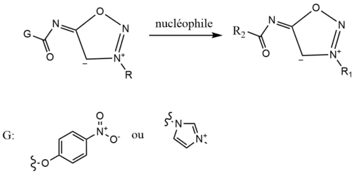 L’ajout de fonctions aux iminosydnones sur leur azote exocyclique peut se faire selon deux méthodes différentes, par l’ajout de p-nitrobenzyl carbamate ou d’un sel d’urée imidazolium. L’ajout de ce sel en milieu basique entraîne la formation de carbonylimidazolium-ImSyd qui avec un nucléophile comme une amine ou un alcool permet la fonctionnalisation de l’iminosydnone sur son azote exocyclique.