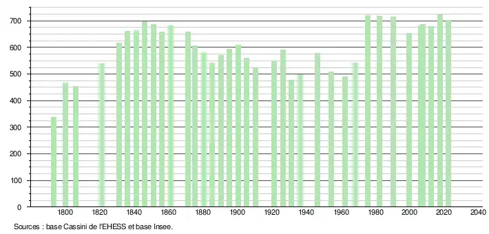 L'évolution du nombre d'habitants est connue à travers les recensements de la population effectués dans la commune depuis 1793. Pour les communes de moins de 10 000 habitants, une enquête de recensement portant sur toute la population est réalisée tous les cinq ans, les populations de référence des années intermédiaires étant quant à elles estimées par interpolation ou extrapolation[20]. Pour la commune, le premier recensement exhaustif entrant dans le cadre du nouveau dispositif a été réalisé en 2007[21].