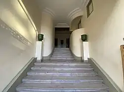 L’intérieur du rez-de-chaussée est remarquable par la qualité de ses espaces. L’entrée et ses larges dégagements distribuant les deux cages d’escalier bénéficient d’une mise en scène particulièrement monumentale et soignée. L’immense double porte de l’entrée principale en fer forgé et en verre donne sur un escalier menant à l’entre-sol. Des supports en maçonnerie pour recevoir des vases en céramique, des sculptures avec un buste de Vercingétorix et du général Desaix du sculpteur Raymond Coulon[5], un dallage en marbre, l’éclairage zénithal filtré par des pavés de verre translucides de couleurs sont autant de détails qui prouvent le faste du traitement de l’entrée de l’immeuble Dalmas[6]. Digne d’un hôtel de par ses dimensions, le hall est recouvert d’encadrements de marbre peints bleus en trompe-l’œil sur les murs, toujours dans l’idée et l’envie de créer une atmosphère résolument luxueuse. Ce hall d’entrée occulte les coulisses du personnel de maison puisque deux portes en face de la grande porte d’entrée mènent aux escaliers de service, aux caves et à l’actuelle loge du gardien. Un autre accès au hall est possible depuis la place Sugny.