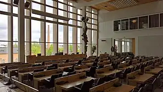 La disposition ressemble à un immeuble de bureaux ordinaire, mais la salle du conseil dépassant de la façade ajoute une particularité et une personnalité au bâtiment administratif[1]. Le restaurant, le hall et les espaces publics sont spacieux et lumineux[4].