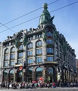 Ce bâtiment de 7 000 m2 sur sept étages a été construit en 1902-1904 par Pavel Suzor, sur commande de la compagnie par actions Singer en Russie. La compagnie venait de construire un gratte-ciel à New York et voulait une construction de prestige dans la capitale de l'Empire russe pour présenter et vendre ses machines à coudre. La hauteur des immeubles ne devait pas selon la loi excéder 23,5 m[1], aussi la compagnie décida-t-elle d'innover par le style et la technique pour impressionner sa clientèle pétersbourgeoise. On éleva un globe au-dessus de la toiture de la coupole à l'angle de la perspective et du canal Griboïedov et on orna les façades de sculptures d'Amandus Adamson (1855-1929), symbolisant le progrès. Ce fut aussi le premier bâtiment de la ville à être construit avec une charpente métallique. Il y avait plusieurs ascenseurs et un toit en partie vitré. Celui-ci pouvait être automatiquement nettoyé de la neige en hiver par un mécanisme spécial.