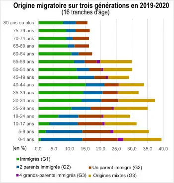 La population étrangère vivant en France s'élève à 5,6 millions de personnes, soit 8,2 % de la population totale. Elle se compose de 4,8 millions d'immigrés n'ayant pas acquis la nationalité française et de 0,8 million de personnes nées en France de nationalité étrangère. 1,7 million de personnes sont nées de nationalité française à l'étranger. Avec les personnes immigrées (7,3 millions), au total 8,9 millions de personnes vivant en France sont nées à l'étranger, soit 13,1 % de la population[47].
