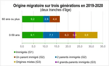 Au , 7,3 millions d' immigrés vivent en France, selon l'Insee, soit 10,7 % de la population totale. 2,5 millions d'immigrés, soit 34 % d'entre eux, ont acquis la nationalité française[45],[46].