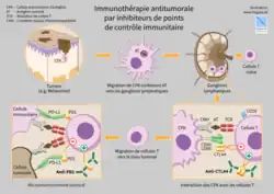 L'immunothérapie se concentre notamment autour de protéines de régulations du système immunitaire, nommées checkpoints du système immunitaire (immune checkpoints ou "points de contrôle du système immunitaire"). Parmi ces protéines, le CTLA-4, PD-1, ou encore TIGIT, qualifiées de rhéostats de la réponse immune[82] : ces molécules permettent entre autres le contrôle de la réponse immune adaptative du fait de leur expression par plusieurs sous-catégories de lymphocytes T (ainsi que d'autres cellules immunocompétentes). Ces molécules permettent une inactivation du système immunitaire et il a été montré que les tumeurs pouvaient, dans le cadre de leur stratégie de résistance et d'échappement tumoral face aux réactions immunes, inactiver la réponse immune anti-tumorale en « épuisant » les lymphocytes par une activation de leurs protéines d'inhibition que sont PD-1, CTLA-4 ou TIGIT (entre autres). Ces molécules sont la source d'un intérêt thérapeutique considérable dans l'espoir de développer des vaccins curatifs à partir d'anticorps monoclonaux inactivant ces protéines.