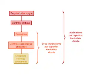 Cette première forme de sous-impérialisme est le modèle anglais des Dominions où une colonie devient elle-même un centre de colonisation et d'expansion à la fois pour elle-même et pour la métropole. Toutefois, ce modèle inclut également des colonies britanniques n'ayant pas le statut de Dominion.