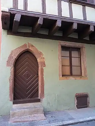 - nos 2-4 : Ces deux maisons mitoyennes de trois étages, avec encorbellement à poutrage apparent, datent partiellement du XVe siècle[6]. Les portes d'entrée, avec encadrement de pierre en forme d'ogive, sont typiques de l'époque gothique[7].
