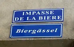 Des plaques de rues bilingues, à la fois en français et en alsacien, sont mises en place par la municipalité à partir de 1995[5]. C'est le cas du Biergässel, littéralement « ruelle de la Bière ».