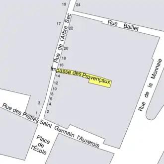 Au XIXe siècle, l'« impasse des Provençaux », ou « cul-de-sac des Provençaux », d'une longueur de 43 mètres, qui était située dans l'ancien 4e arrondissement, quartier du Louvre commençait aux 14-16, rue de l'Arbre-Sec et se terminait en impasse[2].
