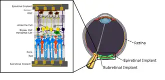Un implant rétinien est un implant électronique qui substitue les photorécepteurs[1] se fixant au niveau de la rétine afin de restaurer partiellement la vision.