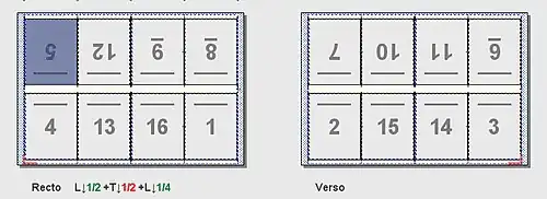 Pour un cahier de 16 pages, par exemple, le logiciel d'imposition assemblera les pages 16 et 1 ensemble pour le recto, puis 2 et 15 pour le verso, et ainsi de suite. La méthode de reliure détermine le mode d'imposition (tête à tête, tête à pied).