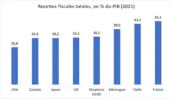 Le montant des recettes fiscales en France s'établit à 45,1 % du produit intérieur brut (PIB) en 2021[3]. La France est en 2021 le 2e pays de l'OCDE aux prélèvements obligatoires les plus élevés derrière le Danemark (46,9 % du PIB). Ce niveau est nettement plus élevé que dans les autres pays développés. En effet, les prélèvements obligatoires représentent 39,5 % du PIB en Allemagne, 33,5 % au Royaume-Uni, 33,2 % au Japon ou encore 26,6 % aux États-Unis. La moyenne de l'OCDE s'établit à 34, 1% (onze points de pourcentage de moins que la France)[3]. Selon l'INSEE, les prélèvements obligatoires en France sont passés de 30,3 % du PIB en 1960 à 45,0 % du PIB en 2018[27].