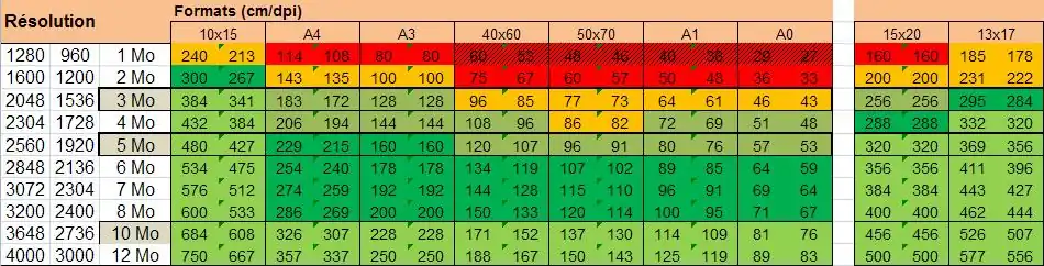 Ce tableau permet de comparer rapidement les possibilités d'impression selon la résolution numérique.