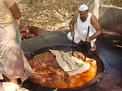 Le tissu lavé est un type particulier de tissu appelé Vichliya, qui est ensuite soumis à un processus d'ébullition en atelier dans une chaudière ouverte — ou bhatti — remplie d'un mélange d’Aal (alizarine), de racines de fleurs Dhawdi et d'eau. Ce processus d'ébullition est effectué pendant 4 heures pour garantir que le tissu soit correctement teint. Après avoir retiré le tissu du bhatti, il est soumis au processus de nettoyage à l'eau. Ensuite, dans le processus suivant, appelé Tapai, les tissus comme le coton, le tussar, la crêpe georgette et la soie sont trempés dans la bhatti toute la nuit et sont ensuite séchés après avoir été lavés dans l’eau de la rivière. Ensuite, dans un seau en ciment, on prépare un mélange d’excréments de chèvres, de sel brut connu localement sous le nom de sanchura, d’huile de ricin et de l’eau, puis le tissu est immergé et piétiné. Dans le processus suivant, le tissu est soumis à un séchage en couches sur une surface de sol inclinée. Le tissu séché est soigneusement rincé à l'eau et préparé pour l'impression[1],[5].