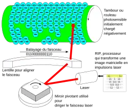 - Insolation : l’unité de pilotage de l’imprimante, RIP (Raster Image Processor), ou encore formatter, convertit les données à imprimer en impulsions de commande du laser. Le laser est dirigé sur un miroir mobile (scanner) qui le renvoie, via un système de lentilles, sur le tambour photosensible. L’utilisation de lasers (souvent des diodes lasers) est justifiée par le fait qu’ils génèrent un faisceau lumineux cohérent avec un haut degré de précision. Au moment où la substance photosensible est éclairée par le laser, elle devient conductrice. La charge négative disparait, le support de cette couche étant en aluminium relié à la masse de l'imprimante. Il se crée ainsi une image électrophotographique latente à la surface du tambour ;