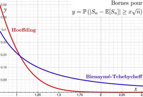 On voit que dans ce cas (et c'est assez représentatif de la situation générale[réf.nécessaire]) l'inégalité de Hoeffding est beaucoup plus précise pour suffisamment grand.