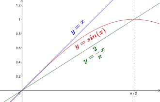 Cela peut être prouvé en utilisant la concavité de la fonction sinus dont la courbe est au-dessus de ses sécantes et en-dessous de ses tangentes[2], ou géométriquement comme ci-dessous[3].