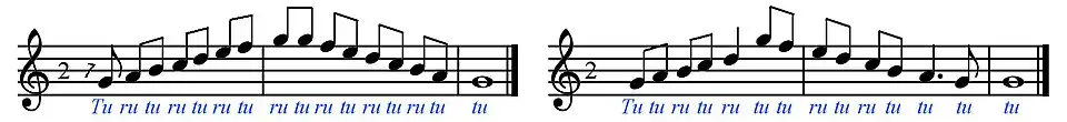Cette deuxième manière de faire produit, dans une suite de croches, un silence plus long après les croches no 2 et no 4, alors que la première manière le produit après les croches no 1 et no 3. Dans tous les cas, le silence principal précède Tu, consonne occlusive, qui stoppe l'air, et non pas Ru, consonne roulée, ni Du, consonne voisée, qui laissent toutes deux passer de l'air.