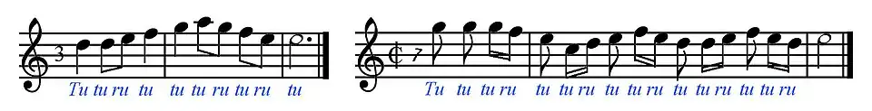 « On doit remarquer que le Tu, Ru, se règlent par le nombre des croches. Quand le nombre est impair, on prononce Tu Ru tout de suite comme l'on voit au premier exemple. Quand il est pair, on prononce Tu, sur les deux premières croches, ensuite Ru alternativement, comme l'on vient de le voir dans le deuxième exemple. On fera bien d'observer que l'on ne doit pas toujours passer les croches également, & que l'on doit dans certaines mesures, en faire une longue et une brève ; ce qui se règle aussi par le nombre. Quand il est pair, on fait la première longue, la seconde brève, & ainsi des autres. Quand il est impair, on fait tout le contraire ; cela s'appelle pointer. Les mesures dans lesquelles cela se pratique le plus ordinairement, sont celles à deux temps, celle du triple simple, et celle de six pour quatre.../... Il y a aussi certains Mouvements où l'on ne se sert que du Tu, pour les croches. On prononce Tu sur toutes ces Croches, & n'on se sert du Ru que sur les doubles Croches.../... On se sert du Ru sur les doubles Croches, suivant les Regles que j'ay données pour les Croches simples : On s'en sert même plus fréquemment : car soit que ces Doubles Croches soient sur la même ligne, soit qu'elles sautent, on ne laisse pas de le faire[2]. »