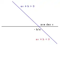 - Si a < 0, « la droite descend » et ax + b est d'abord positif (pour x < - b/a) puis négatif