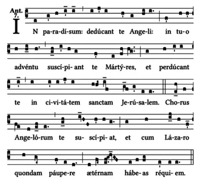 - ↑ Voici un document publié tardivement : Cérémonial monastique à l'usage des religieuses bénédictines du Très-Saint Chœur de Marie Abbaye Saint-Pierre de Pradines, p. 313 (1855) ; le cérémonial distinguait les deux antiennes : « les Antiennes In Paradisum et Chorus Angelorum ».
