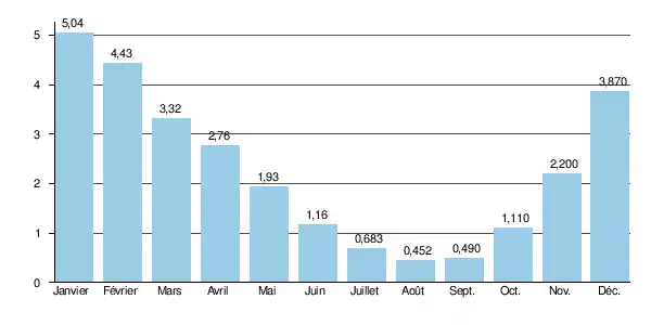La lame d'eau écoulée dans son bassin versant est de 623 millimètres annuellement, et le débit spécifique de 19,7 l/s/km2. Ces valeurs élevées sont comparables à celles des bassins versants voisins et s'explique en partie par des précipitations abondantes sur son bassin, de l'ordre de 1 200 mm par an.
