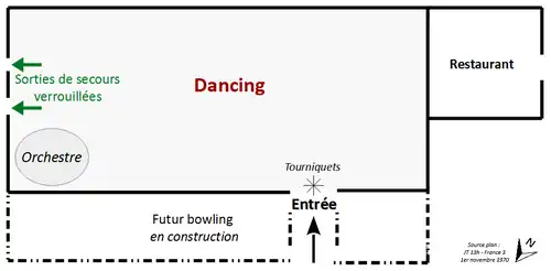 Ils déposent le , deux jours avant de créer la société d'exploitation du futur dancing[1], un permis de construire, sur un terrain au bord de la route nationale 520 (devenue route départementale en 1972), à environ deux kilomètres du centre de Saint-Laurent-du-Pont et de la commune limitrophe de Saint-Joseph-de-Rivière[4]. Il s'avère qu'ils ont déjà commencé les travaux depuis un mois. Leurs idées changeant avec le temps, le lieu terminé n'a plus grand-chose à voir avec le permis de construire qui a été accordé[1]. Le maire Pierre Perrin ne contrôle jamais les travaux et le préfet n'envoie jamais de commission de sécurité sur place[5].