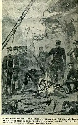 Cependant, à 9h00, l'escadre russe aperçoit l'Izumi Maru, et l'amiral Bezobrazov envoie le Gromoboï l'attaquer. Il ouvre le feu, tuant ou blessant plus de 30 hommes avant que le navire japonais ne s'arrête et ne se rende. Environ 100 hommes malades ou blessés sautent à l'eau avant que le navire ne coule à l'ouest d'Okinoshima, avec à bord ceux qui ont refusé de sauter. Vers 10h00, l'escadre russe aperçoit le Sado Maru et est repérée par la flotte japonaise en même temps. Malgré le fait qu'il ait donné 40 minutes au transporteur japonais pour se rendre et abandonner le navire, le Riourik tire deux torpilles qui explosent et tuent 239 passagers et membres d'équipage, mais le navire ne coule pas. Il dérive pendant 30 heures avant de s'échouer sur Okinoshima.