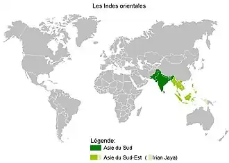 Le terme géographique d'Indes, ou Indes orientales, est utilisé à l'époque coloniale par les Européens pour désigner les territoires d'Asie du Sud et du Sud-Est, c'est-à-dire les actuels Béloutchistan iranien, Pakistan, Inde, Népal, Bhoutan, Bangladesh, Birmanie, Sri Lanka, Maldives, Thaïlande, Malaisie, Viêt Nam, Cambodge, Laos, Philippines, Brunéi, Singapour, Timor oriental et Indonésie (appelée Indes orientales néerlandaises avant l'indépendance), à l'exception de la Nouvelle-Guinée occidentale, qui fait partie de la Mélanésie.