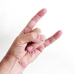Tendu et associé à l'auriculaire également tendu, les autres doigts replié, l'index participe au geste des cornes, réalisé depuis des temps immémoriaux, et toujours pratiqué dans certains pays pour neutraliser le mauvais œil ou tourner en dérision un mari cocu[2].